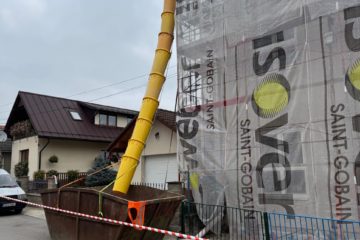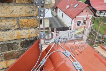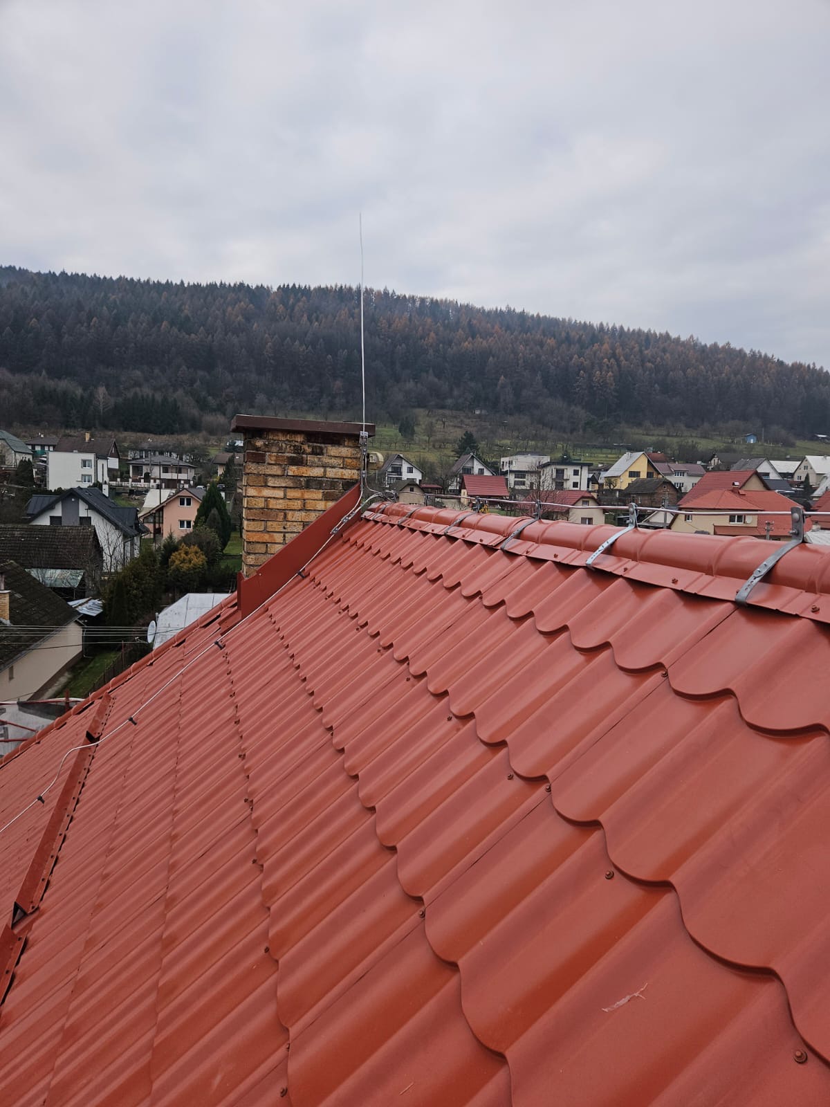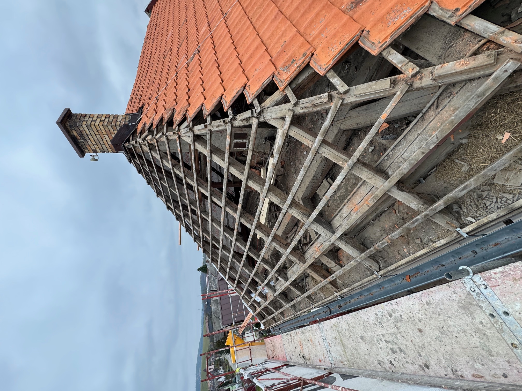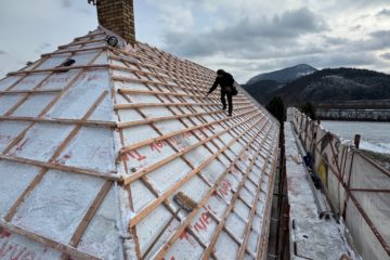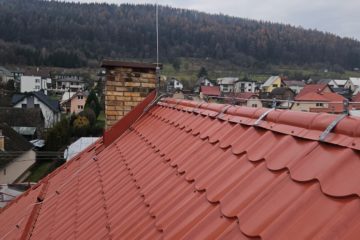 Práce: demontáž pôvodnej strešnej keramickej krytiny, oprava + doplnenie krokiev, parozábrana + latovanie, strešná krytina Lindab 35, nový bleskozvod