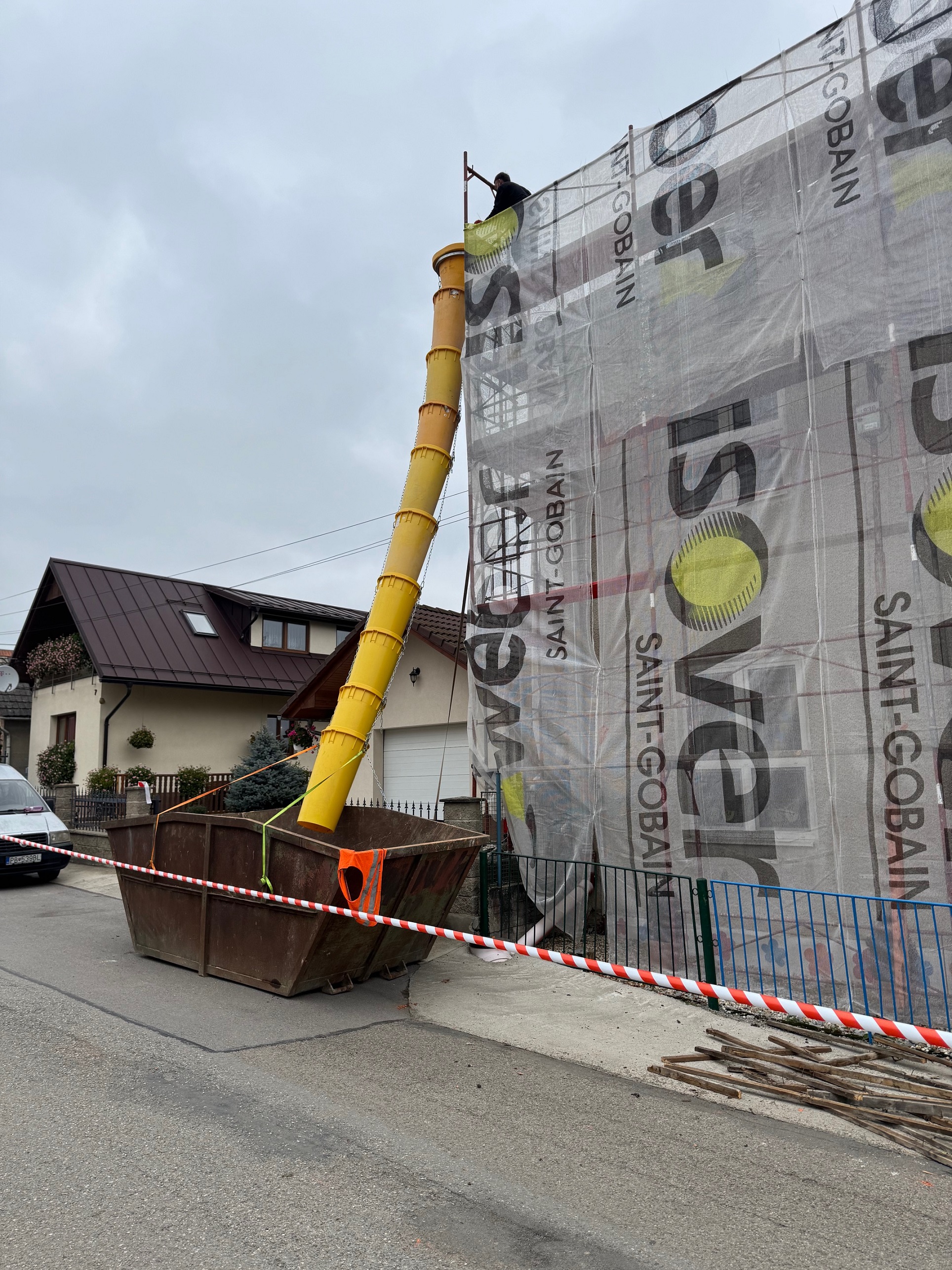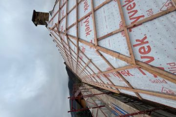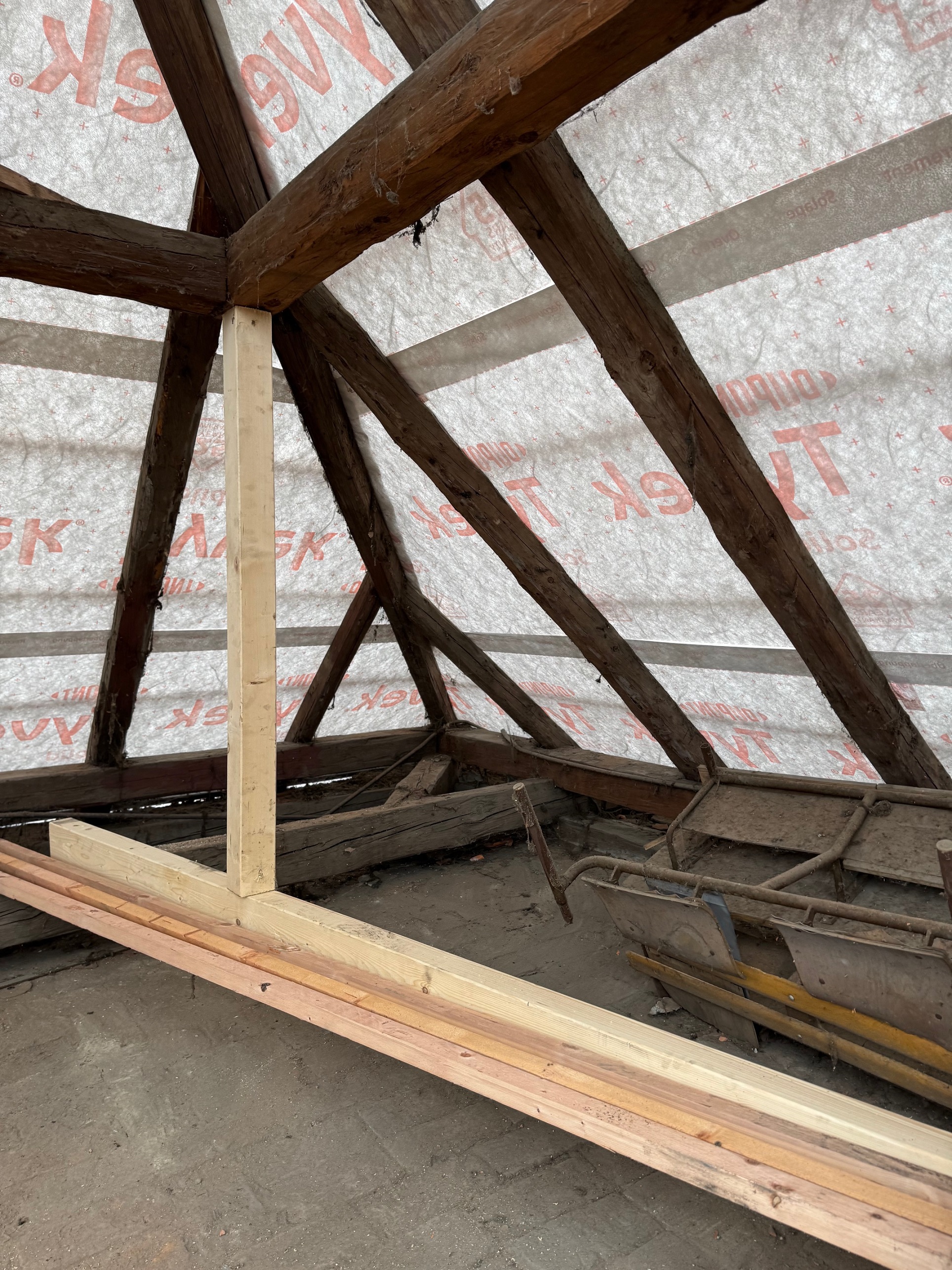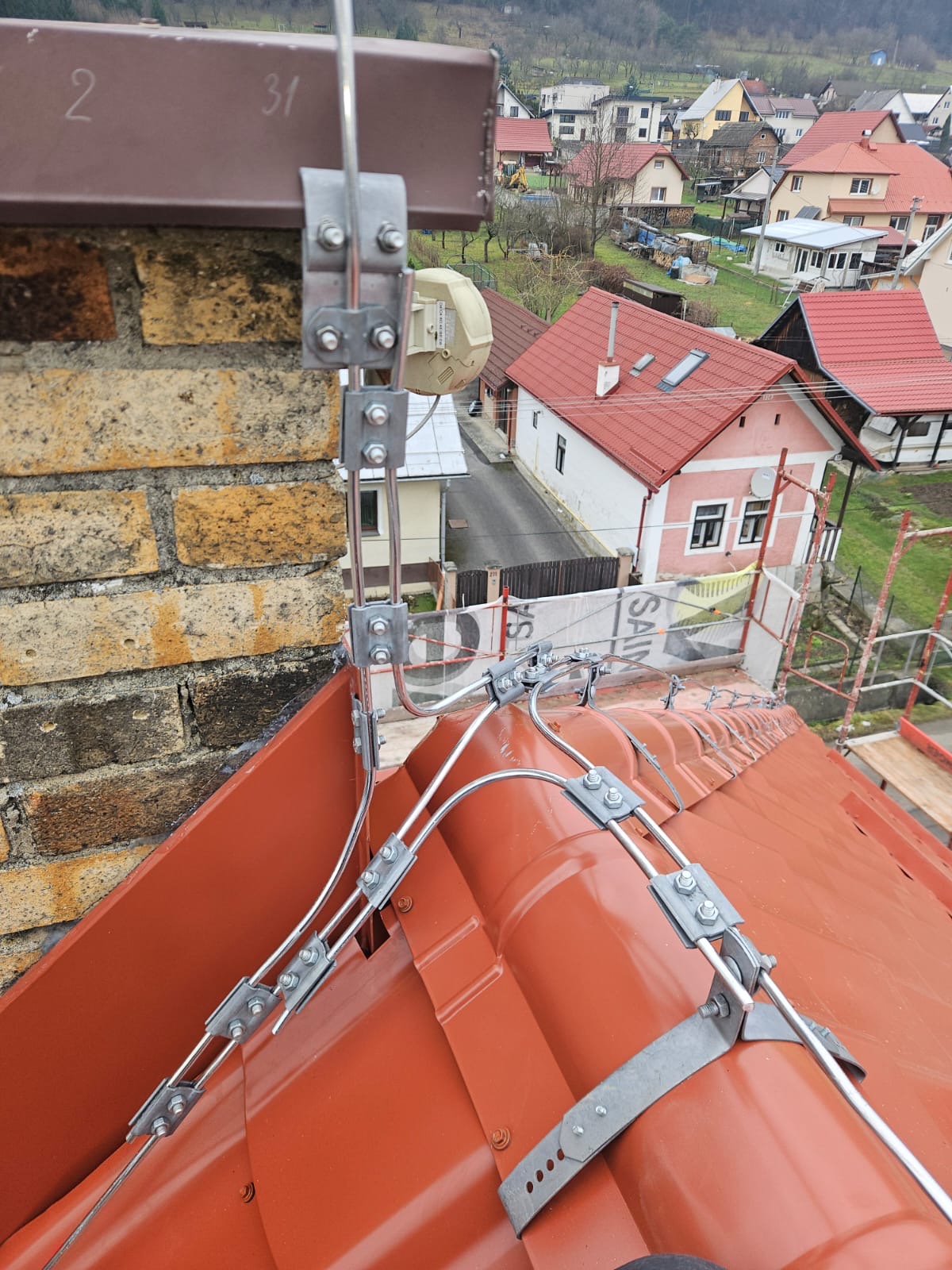 Práce: demontáž pôvodnej strešnej keramickej krytiny, oprava + doplnenie krokiev, parozábrana + latovanie, strešná krytina Lindab 35, nový bleskozvod